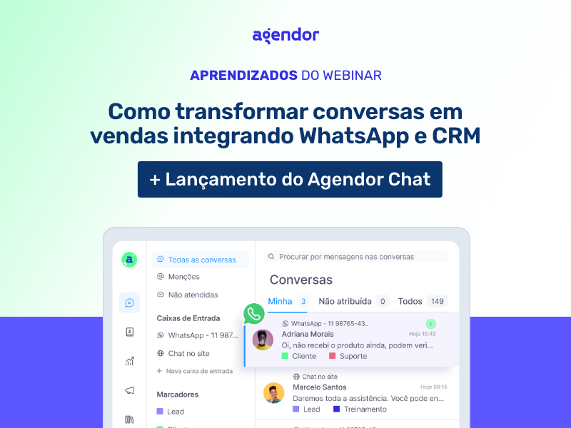 Esses dados foram compartilhados por Gustavo Gomes, Líder de Vendas do Agendor, durante o webinar de lançamento do Agendor Chat, solução que integra WhatsApp e CRM para transformar conversas em vendas.